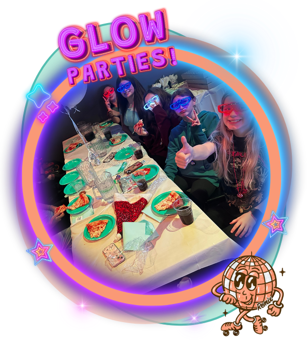 2.5HR GLOW Birthday party package is available on Fridays and includes all the fun stuff below under awesome glow lights around the rink! You and your guests also receive glow giveaways from your dedicated party host! Take a look at all this party includes: