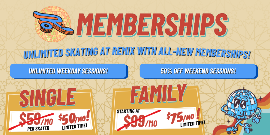 Memberships have their perks at Remix! Enjoy lots of benefits as a Roller Ruler! Our membership program includes multi-member discounts, unlimited weekday rink access and discounts on weekends! Our Memberships are on sale now!